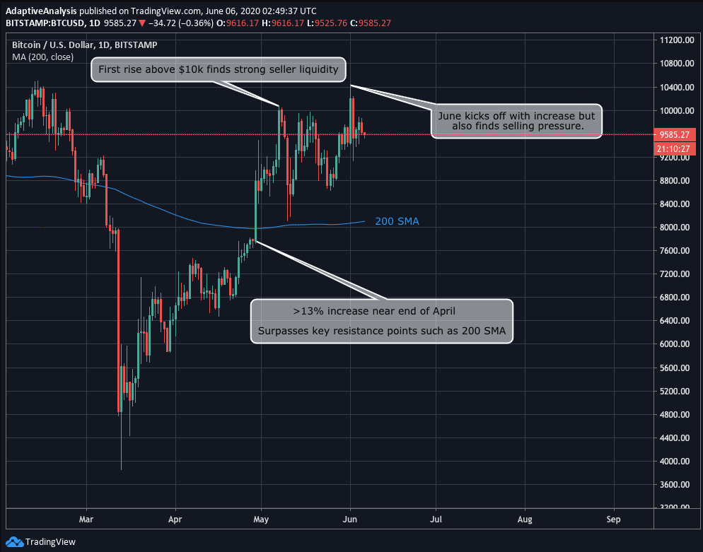 However, after an over 13% price increase at the end of April and a rise to above $10k at the start of May, investors had a more optimistic outlook entering a new trading month in May. What ensued was a volatile month with price finding strong selling pressure around $10k on several occasions.