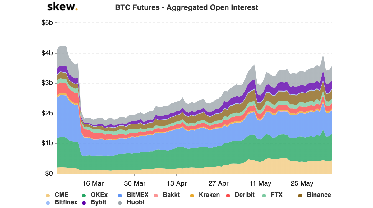 For instance, open interest in the Bitcoin futures markets approached March highs on June 1st. But after the CME June futures contract surpassed $10,550, strong selling pressure ensued and trading closed at $9,585.. The decline catalyzed roughly $500 million in liquidations across the Bitcoin futures market as illustrated in the above graphic.
